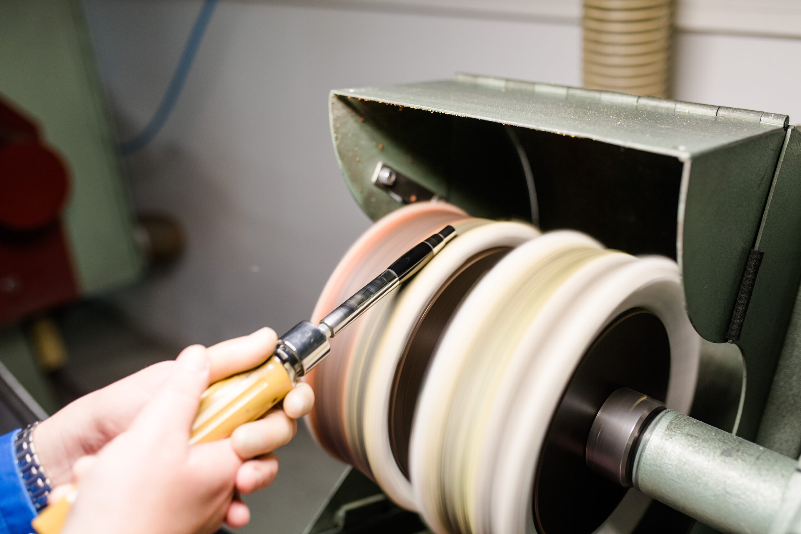 An der Schwabbel werden die exklusiven Hüllen der Schreibgeräte gefertigt.