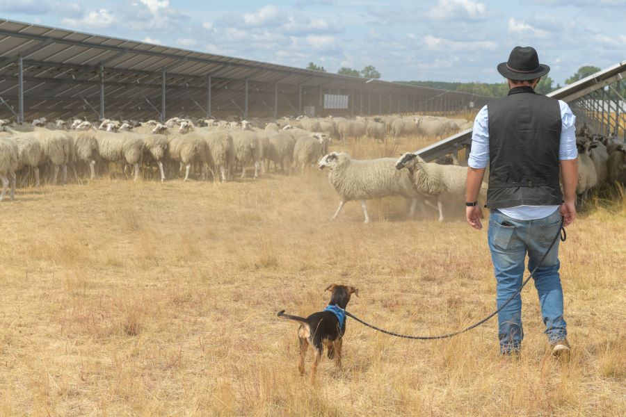 Fleißige Mitarbeiter auf vier Klauen: Die Schafe von Jonas Scholz pflegen die Wiese unter dem Solarpark an der südlichen A10. Er checkt, ob alle Tiere gesund sind. Die drei Monate alte Hirtenhündin Fee wird schon bald die Aufgabe des Treibens übernehmen. Sie ist ein “Working Kelpie”, eine australische Hirtenhundrasse.