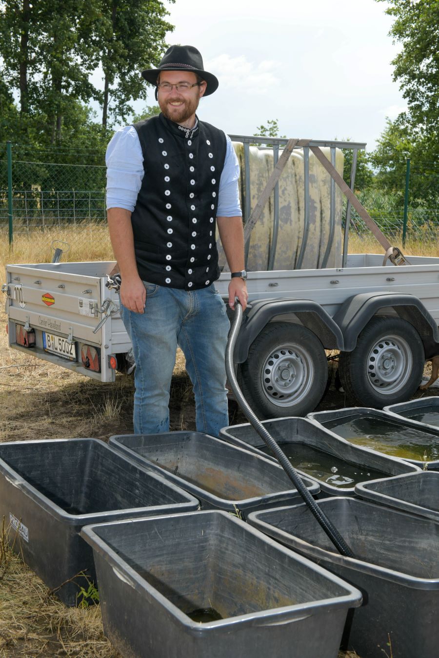 Auf den ersten Blick wirkt die Arbeit des jungen Schäfers idyllisch. „Ich muss jeden Tag raus, nach den Tieren sehen und mit ihnen weiterziehen. Egal, ob es 30 Grad im Schatten sind oder aus Eimern regnet, ob Weihnachten ist oder Geburtstag.“ Wenn ein Tier krank oder verletzt ist, kümmert er sich. Der Schäfer checkt täglich alle Zäune, um dem Wolf keine Chance zu bieten. Vor allem aber muss er Wasser auf die Weiden bringen, im Sommer sogar sehr viel Wasser. „Die Wiesen sind dieses Jahr nicht saftig, sondern eher Heu. Entsprechend groß ist der Durst der Tiere.” Statt einem Kubikmeter Trinkwasser bringt Jonas Scholz an trockenen Tagen bis zu drei Kubikmeter. Das heißt, bis zu drei Mal Nachschub holen. Da die dürren Weiden weniger nahrhaft sind, müssen die Schafe öfter umziehen. Das heißt, ständig neue Koppeln einrichten.