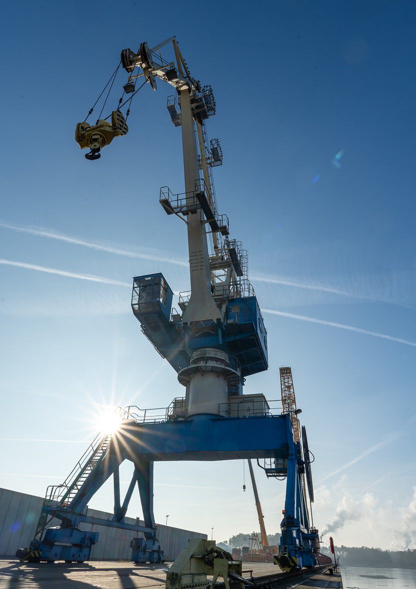 Der Portalkran vom Schwedter Hafen verfügt über eine Hebekapazität von 45 Tonnen und einen Bewegungsradius von 360 Grad.