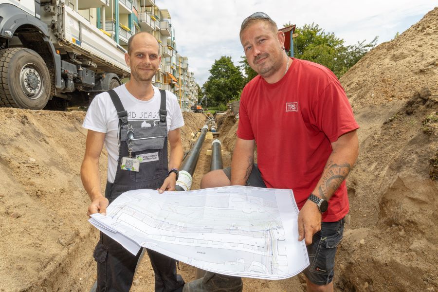 Seit Juli wird Am Kanal 1–10 eine rund 60 Jahre alte Fernwärme-Hauptleitung im offenen Graben auf 210 Metern saniert.